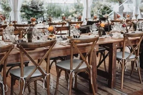 Auch in Scheunen, Zelten oder modernen Eventlocations wirken Crossback Stühle sehr stimmig, weil sie einen angenehmen Kontrast zu glatten Materialien und großen Räumen bilden.