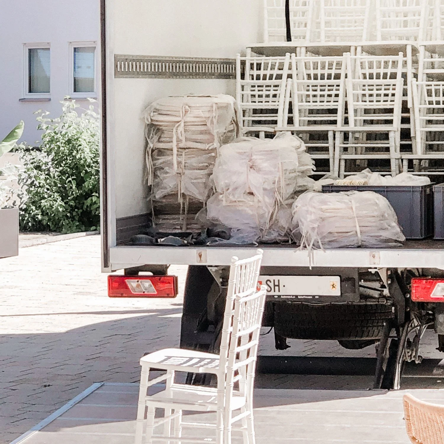 Kunststoffstühle funktionieren gut für funktionale Setups. Tiffany Stühle aus Holz hingegen fügen sich natürlicher in den Raum ein und wirken weniger künstlich – besonders bei Outdoor-Locations, Scheunen, Gärten oder modernen, reduzierten Konzepten.